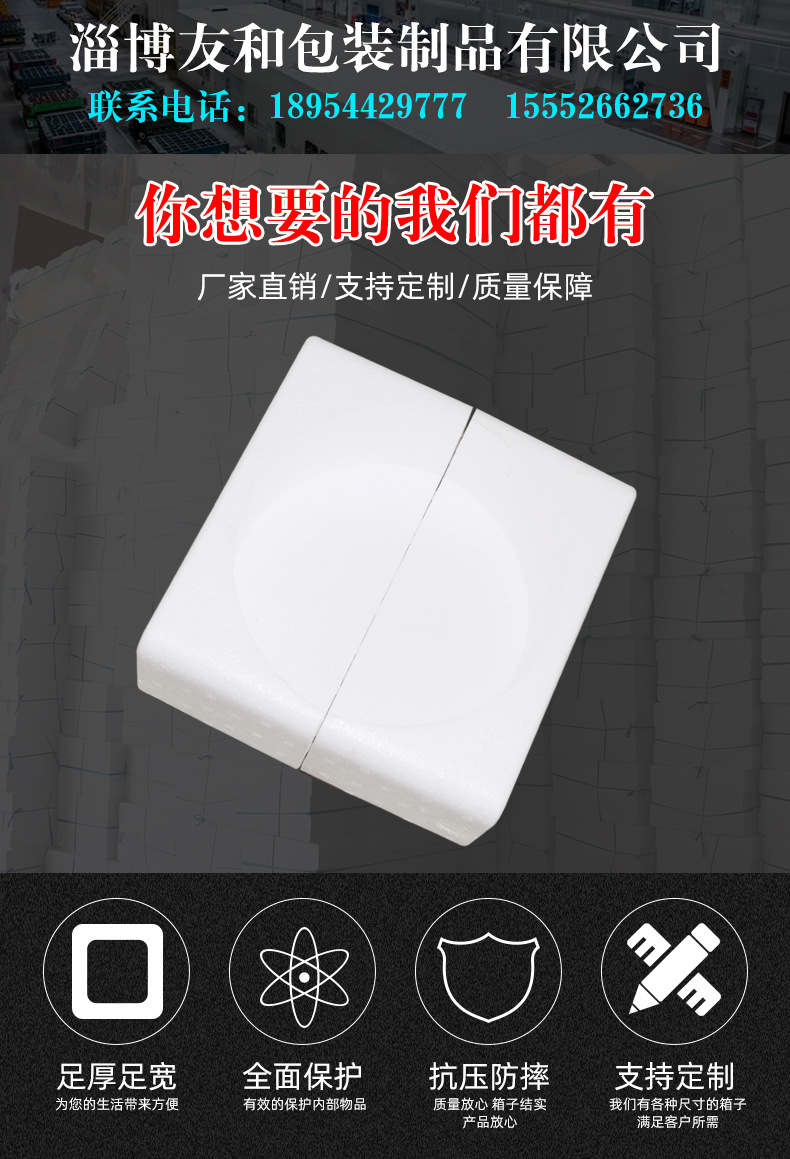 介紹參數圖冊 ????淄博友和包裝制品有限公司是專業的山東泡沫包裝箱加工廠家,本廠主要產品有:泡沫包裝箱,泡沫保鮮箱,水果蔬菜泡沫包裝箱,水果蔬菜泡沫保鮮箱,瓷磚泡沫包裝箱等,產品暢銷全國,深受用戶好評。泡沫包裝定做可以聯系我們網站 http://m.w7712.cn/ 上電話,我們會第一時間跟您聯系。 上一篇泡沫箱定做 藥店正方形大藥盒 下一篇藥用泡沫箱 醫用藥盒包裝箱